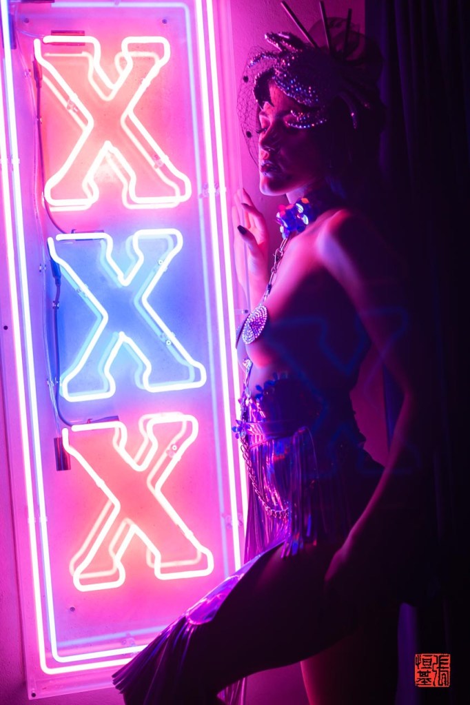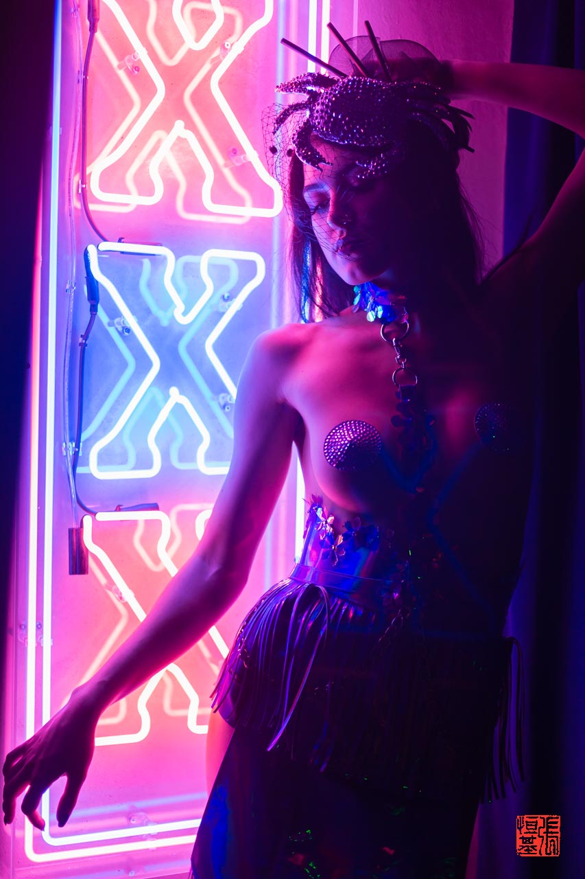 Shooting Lyssa Asgaard in front of these XXX neon light, wearing this purple outfit by adazanditoncouture.