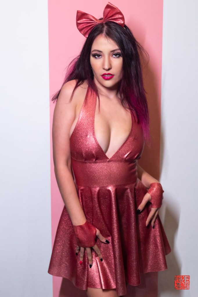 Psycatt is wearing this Pleated Halter dress, Head Bow and Mits in Dusty Pink Glitter latex sheet and made by the brilliant Yummy Gummy.