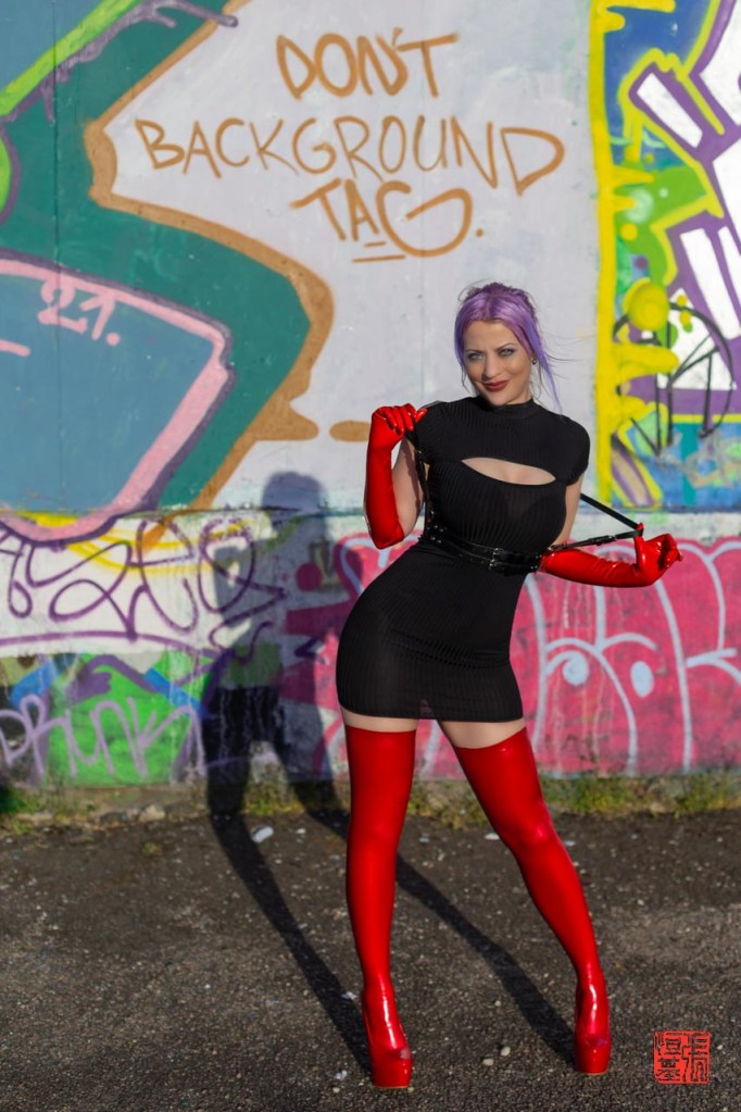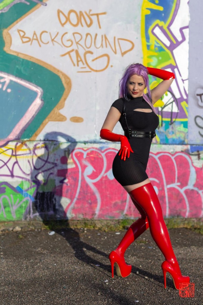 In this set, the look that Purple Muffinz was wearing, we thought, we wanted an urban look and we saw these graffiti walls and just wanted to shoot in front of them. Also, the Purple Muffinz wanted to show off her lovely red latex gloves.