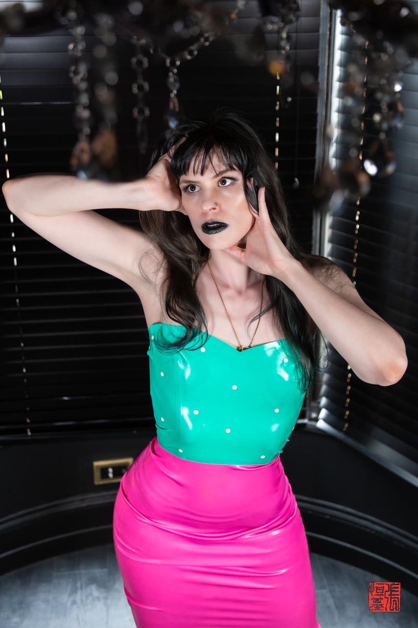 Check out Candyylocks in this hot pink skirt and green top which resembles a tasty watermelon. Got to love the contrasting colours from what Candyylocks is wearing to the black room of where we were shooting.