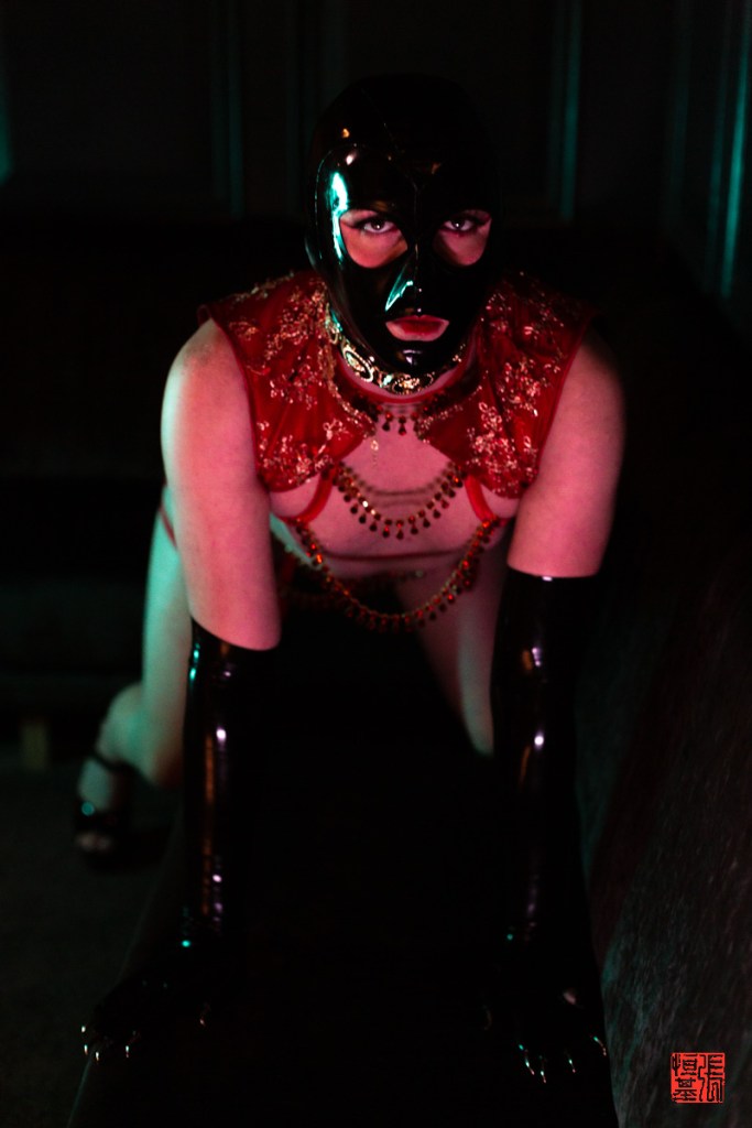 I love working with Bambbiii and what they are wearing as well. I am a massive fan of their work, I have photographed with them whenever I can at the Le Boutique Bazaar event. Also, I love the latex hood and gloves that Bambbiii is wearing, it just compliments the whole outfit.