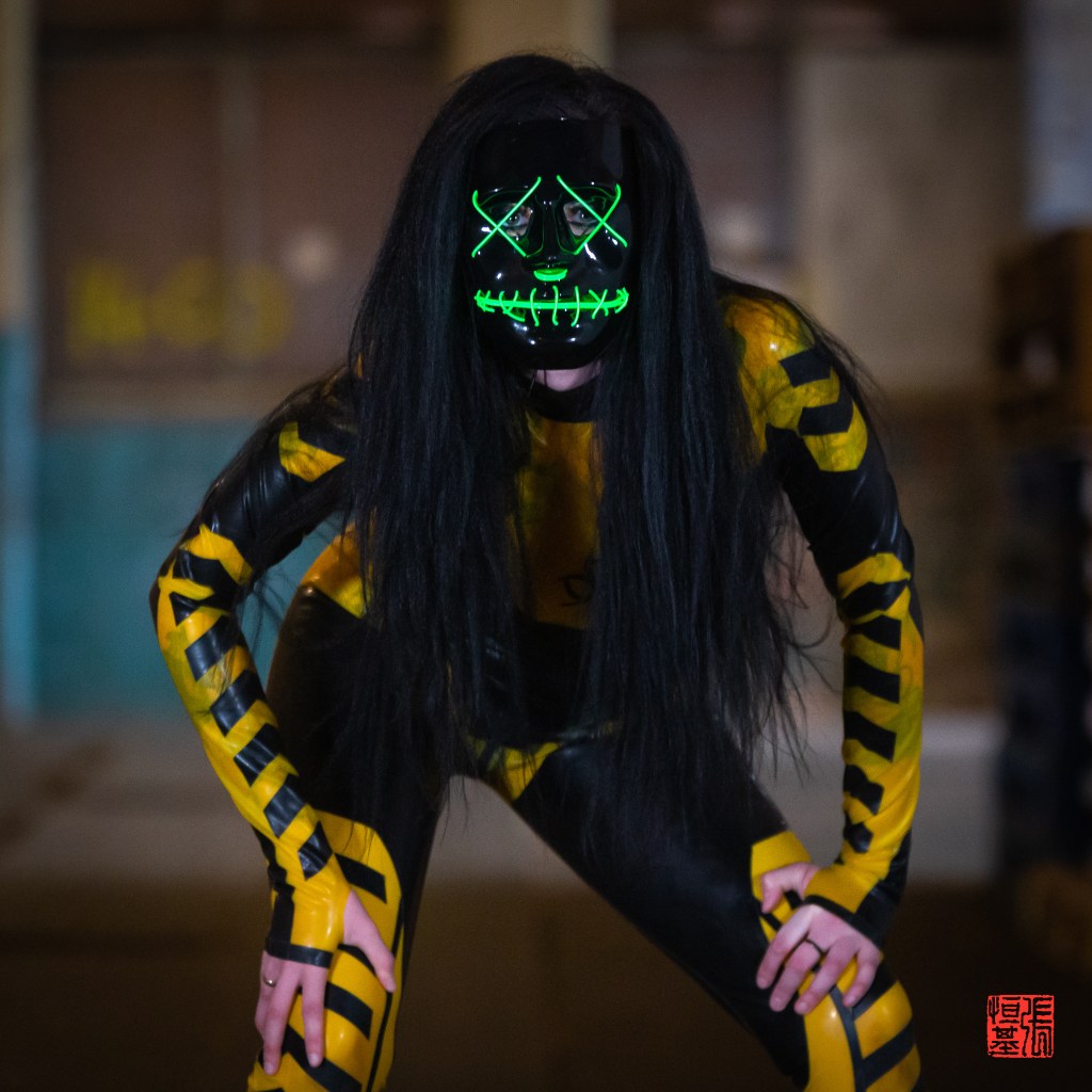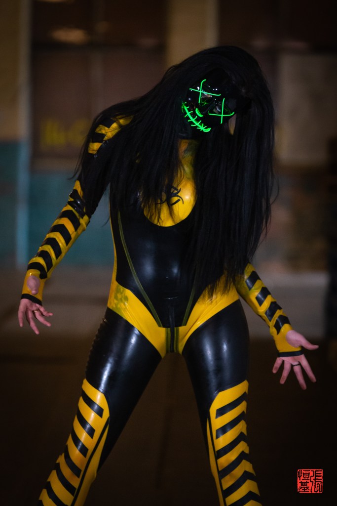The model, “Lucille La Rose“, was absolutely stunning in the latex catsuit. The bright yellow colour and the radioactive design really stood out, and Lucille looked incredibly confident and empowered.