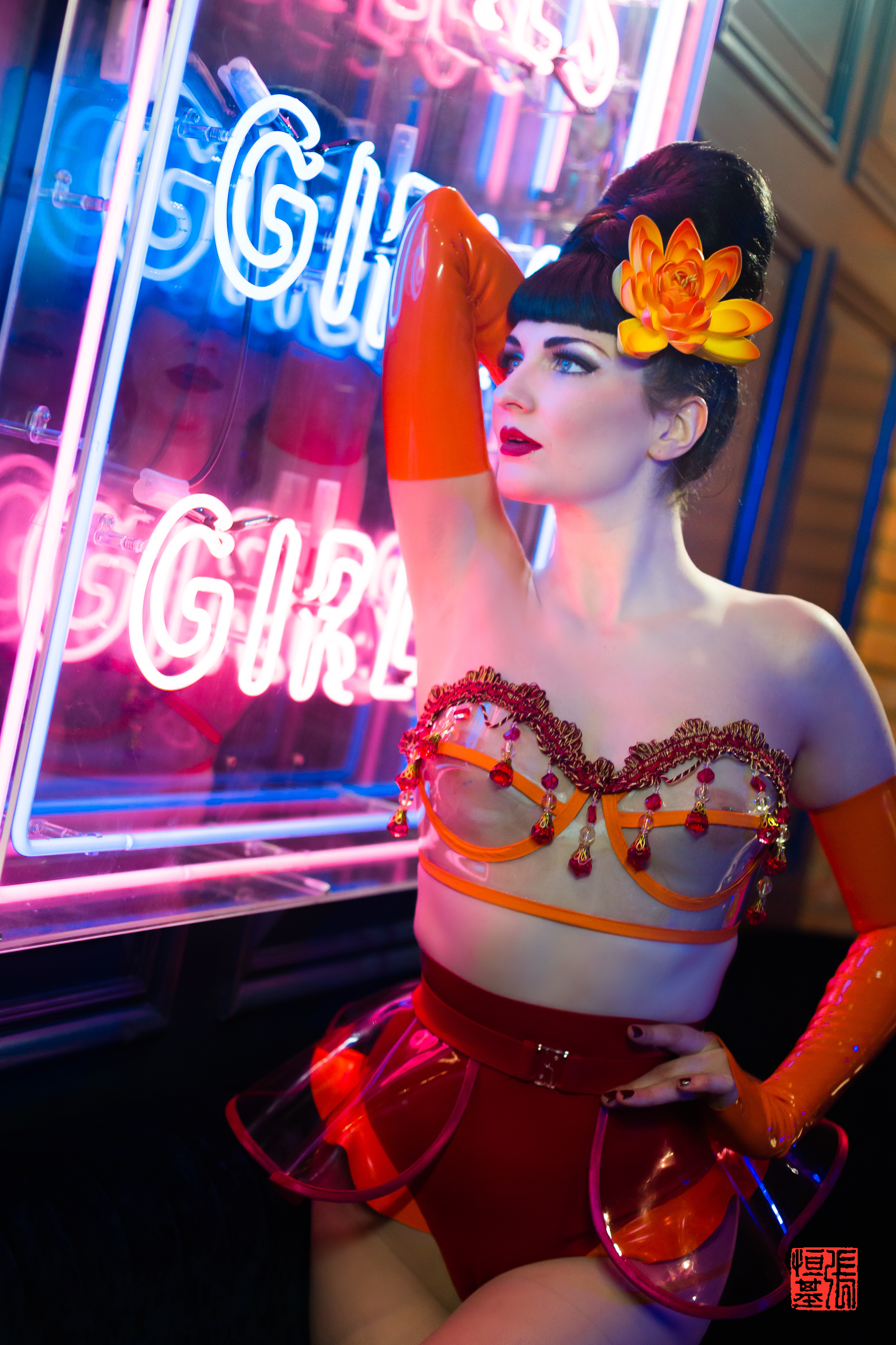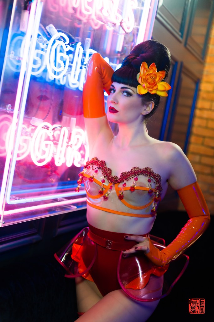 One of the things I loved most about this photoshoot was the way the neon lights interacted with the model’s makeup and latex outfit, made by Tyutyu Design. The bright lights created a nice effect on the latex outfit.