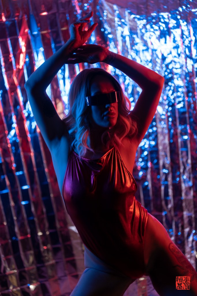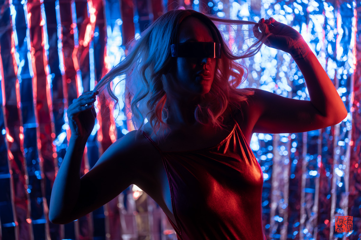 I wanted to capture the dark and edgy side of cyberpunk, as well as its beauty and mystery. I used a variety of lighting techniques to create different moods and effects. A favourite shot is a full-body shot of Everly standing in front of the metal sheet with coloured lights shining on it.