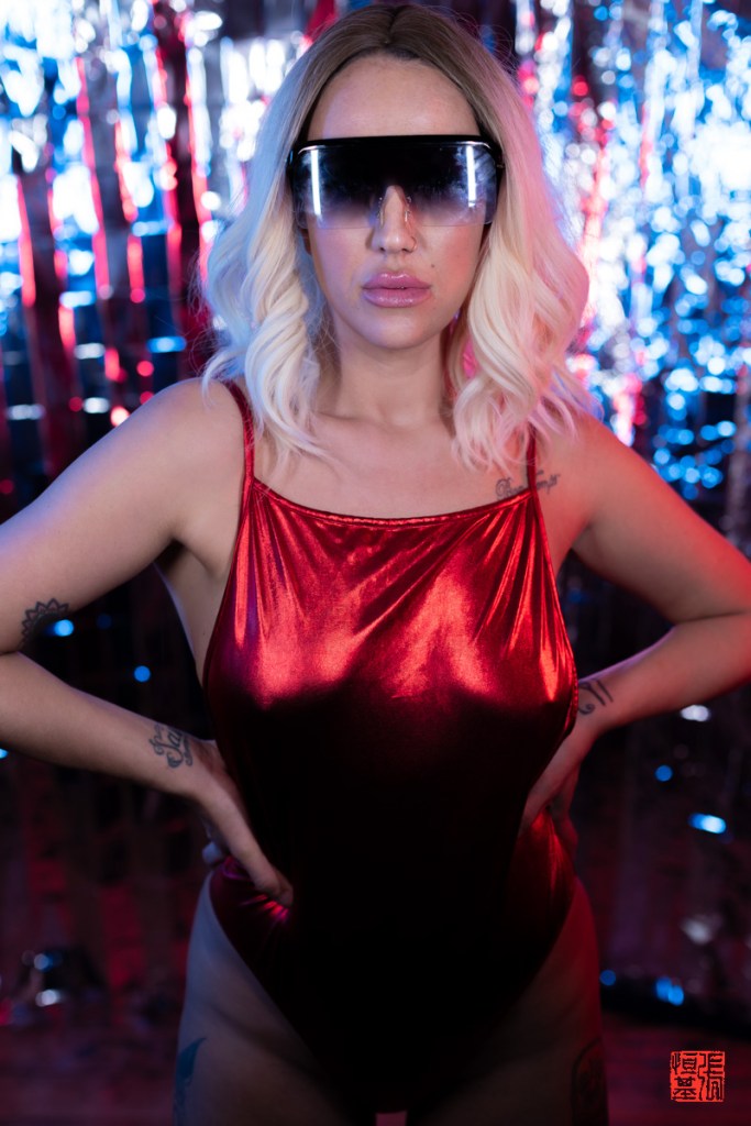 She was just wonderful to work with, someone with significant experience in front of the camera and we picked a great combination of photos in front of this silver screen with coloured lights.