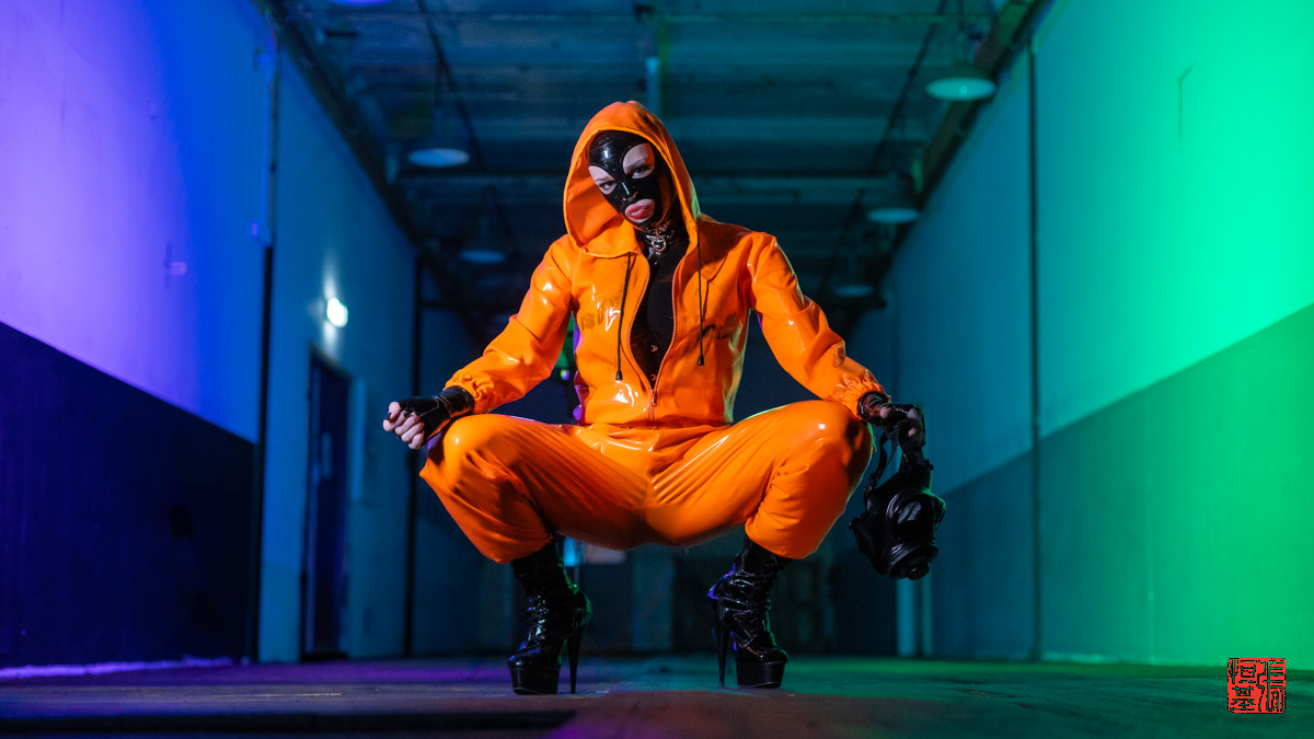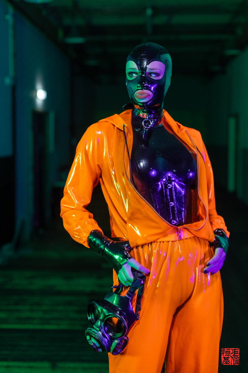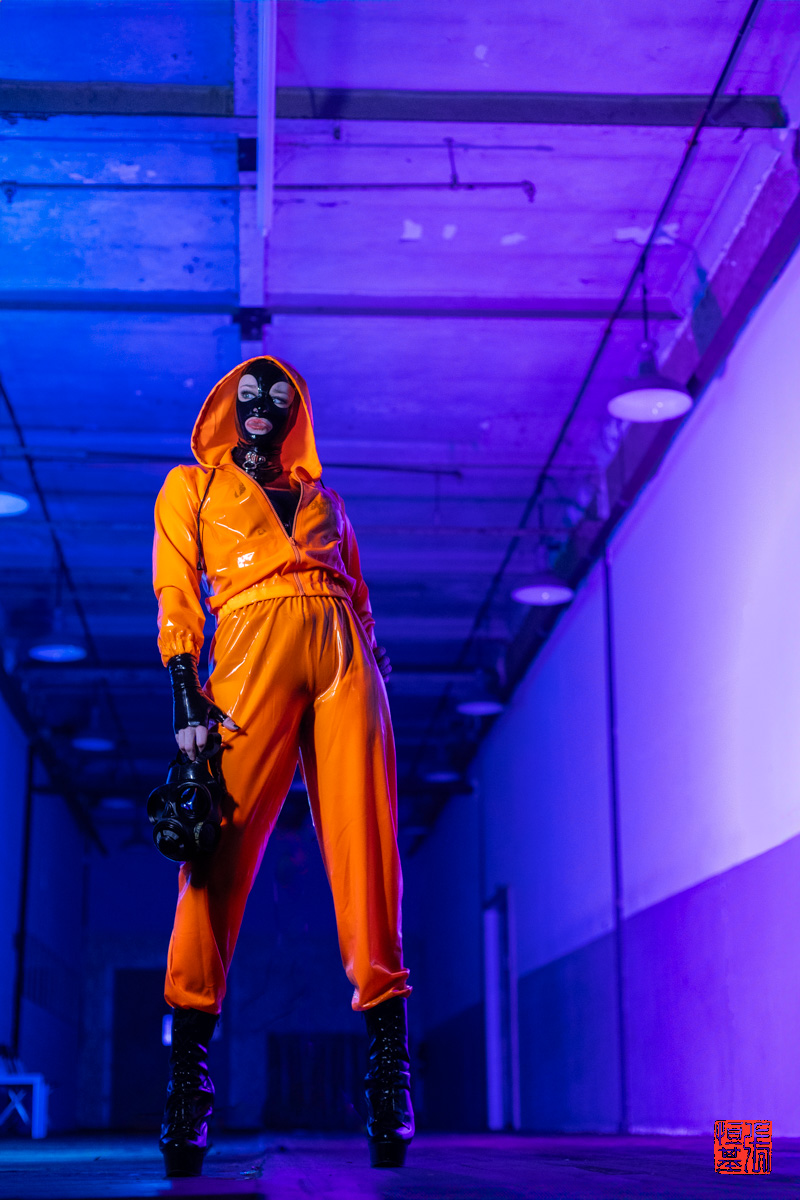 Montrose Studios became a vibrant playground for a recent shoot featuring the radiant Princess Latex Rubber Doll. Clothed in a head-turning, shiny latex with a latex orange hoodie, she wasn’t just a model; she was a burst of sunshine personified. The creative energy crackled as we experimented with colored lights, bathing the studio in a kaleidoscope of hues. The latex orange of the hoodie danced with the blues, green and purples, creating an electrifying atmosphere.