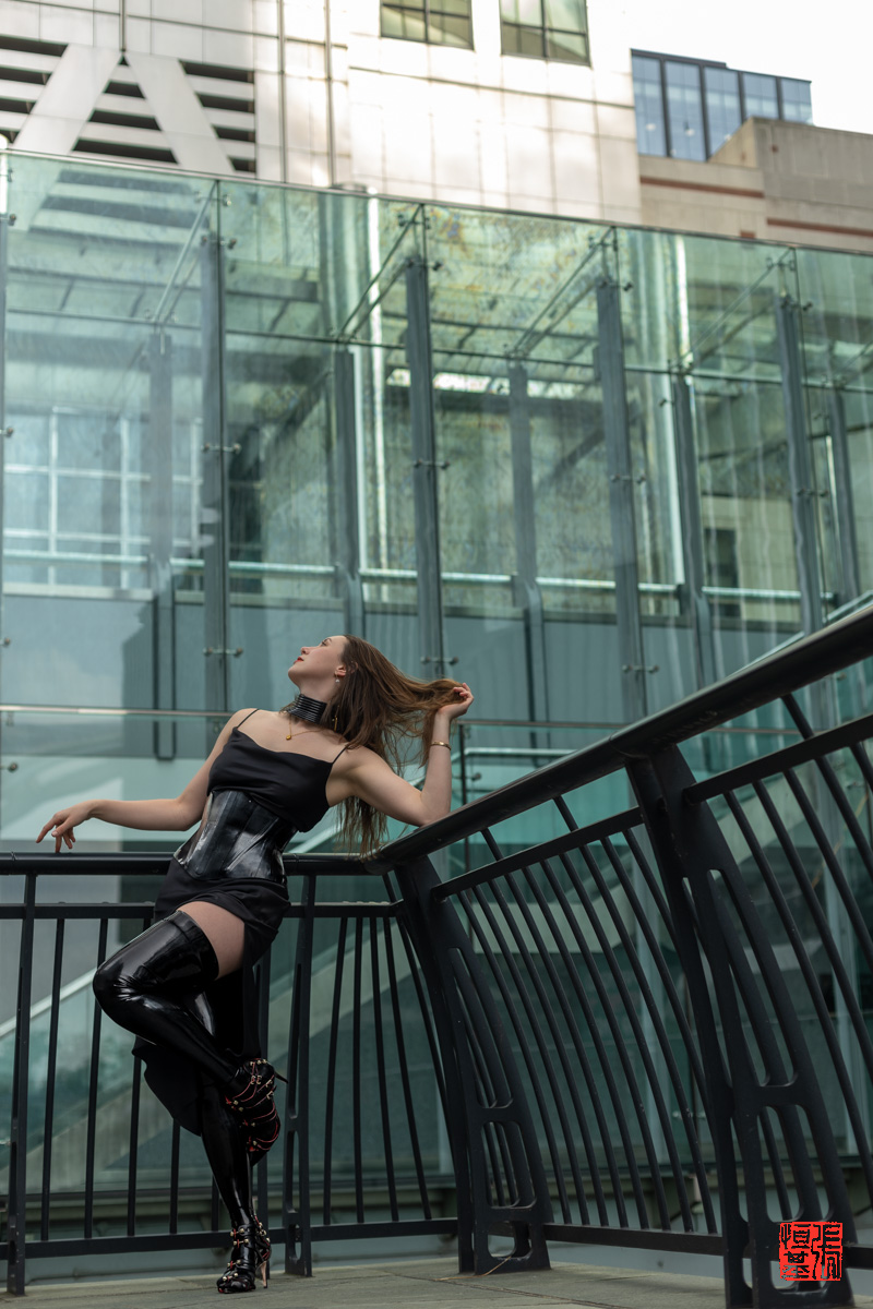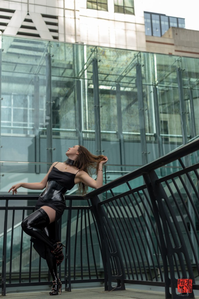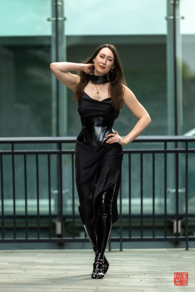 The streets of London became our runway for a recent shoot featuring the enigmatic LatexNChill. Forget stuffy studios – the urban landscape provided the perfect backdrop for her captivating blend of edgy and elegant. LatexNChill, adorned in a stunning black satin dress that cascaded down her figure, exuded an air of mystery that perfectly matched the city’s vibe. The pièce de résistance? A shiny black corset that cinched her waist with black latex leggings, adding a touch of rebellion to the classic silhouette.