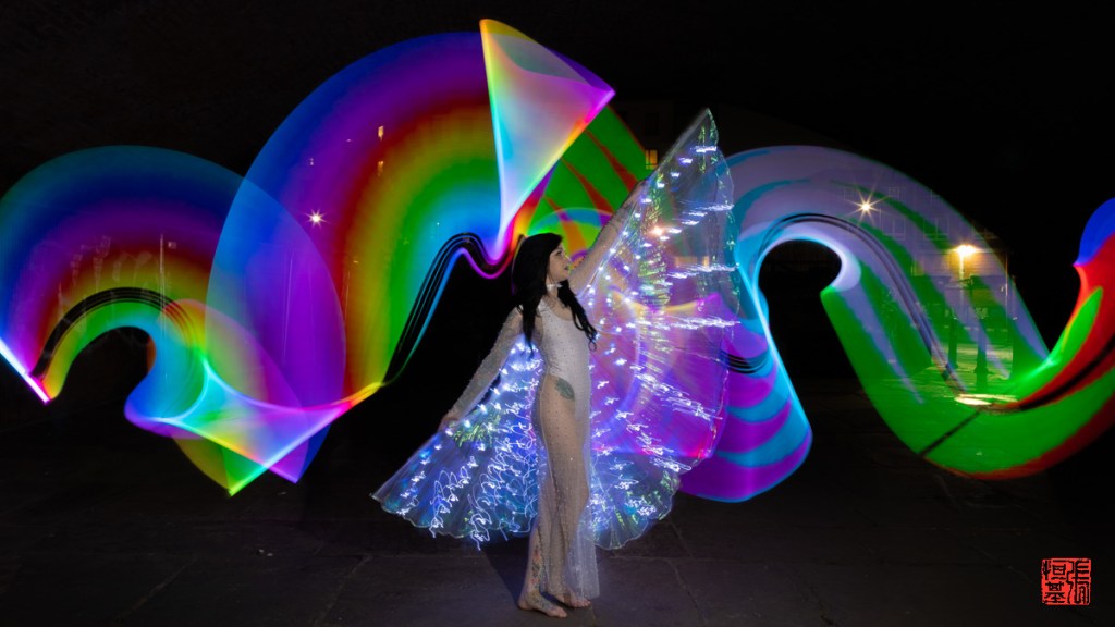 SJ Jinxx was a celestial being adorned with magnificent Isis wings. The wings, catching the fading light, seemed to shimmer with an otherworldly glow. But the real magic happened when we introduced light painting. With each deliberate movement of a light source, trails of vibrant colour danced across the scene, weaving stories of light and shadow around Jinxx.
