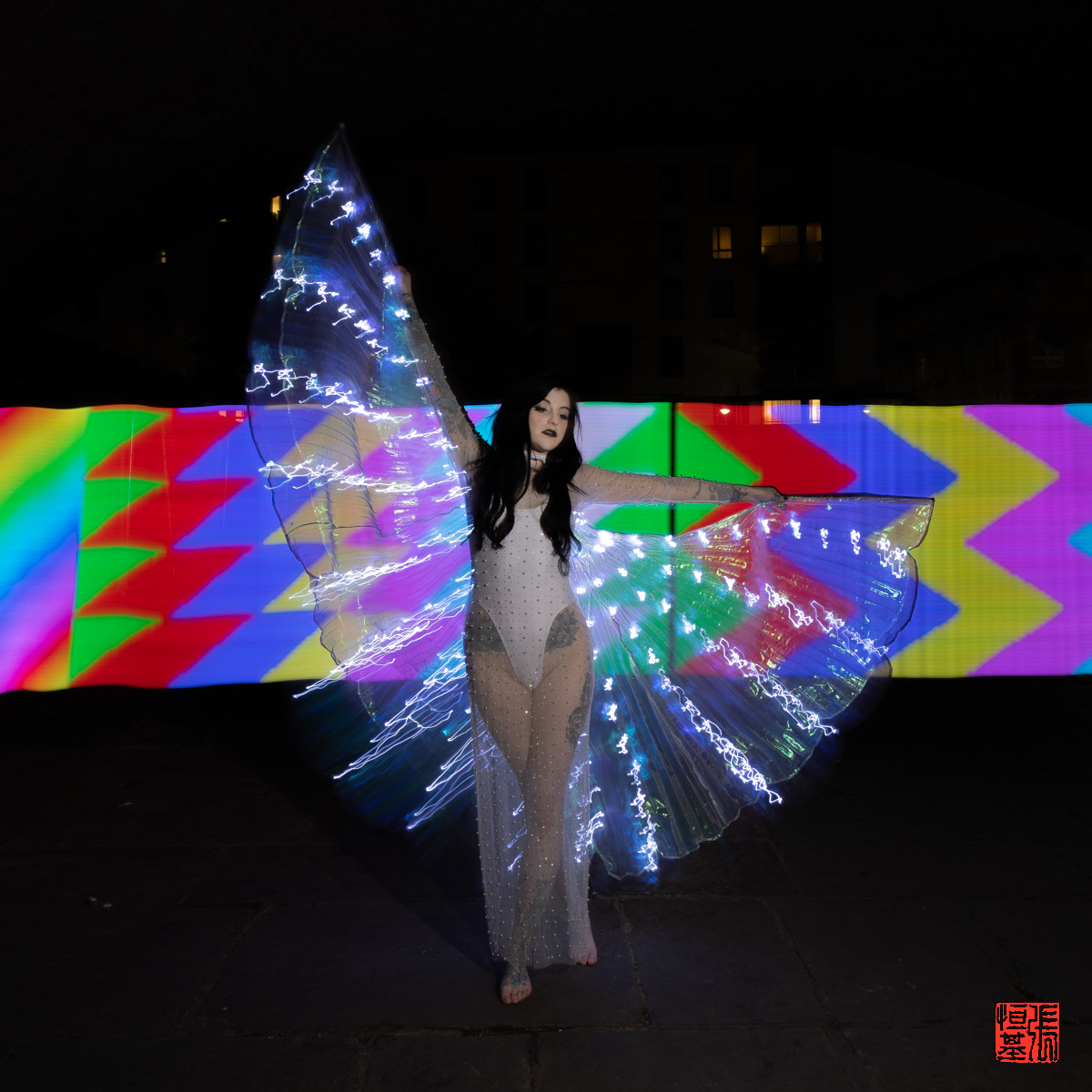 SJ Jinxx was a celestial being adorned with magnificent Isis wings. The wings, catching the fading light, seemed to shimmer with an otherworldly glow. But the real magic happened when we introduced light painting. With each deliberate movement of a light source, trails of vibrant colour danced across the scene, weaving stories of light and shadow around Jinxx.