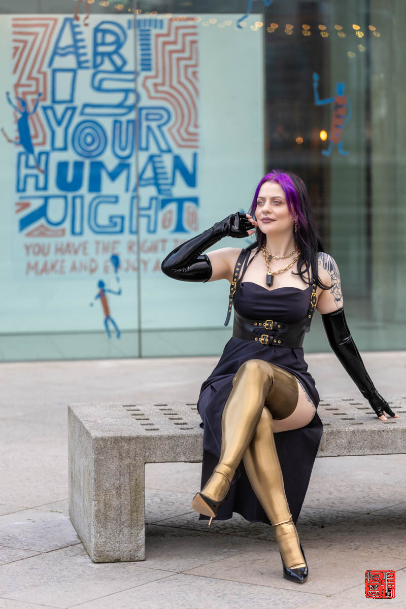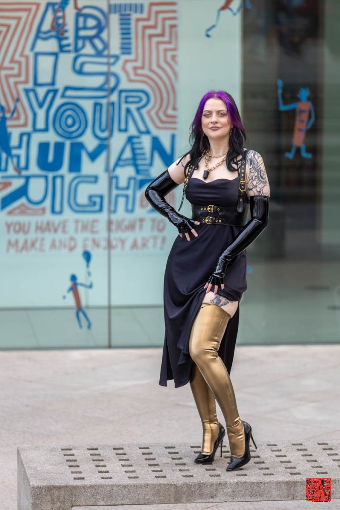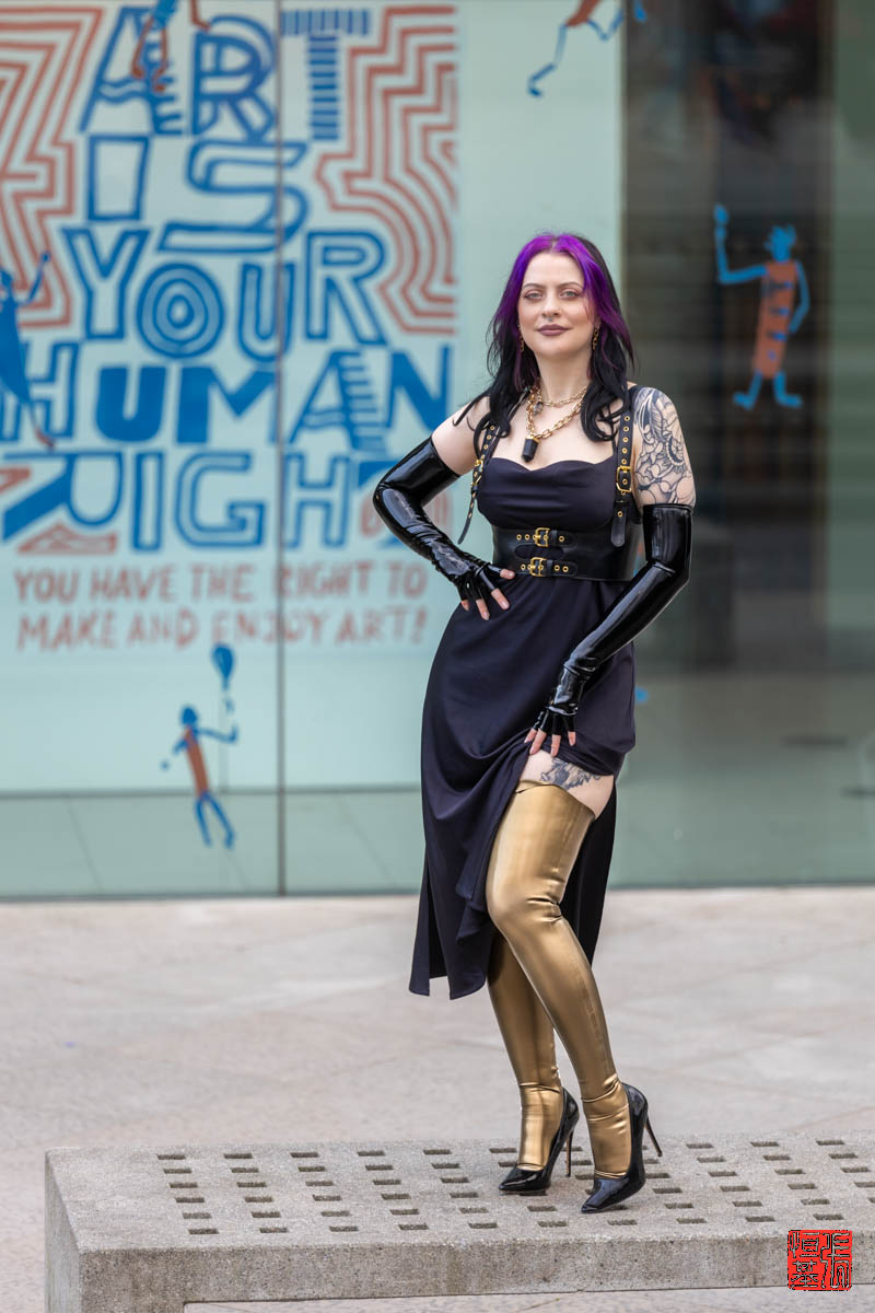 Against a stark backdrop emblazoned with the bold declaration “Art is Your Human Right,” PurpleMuffinz stands defiant, her pose radiating confidence. Her attire is anything but ordinary: high-gloss gold latex leggings hug her form, accentuated by black latex gloves that gleam in the light.