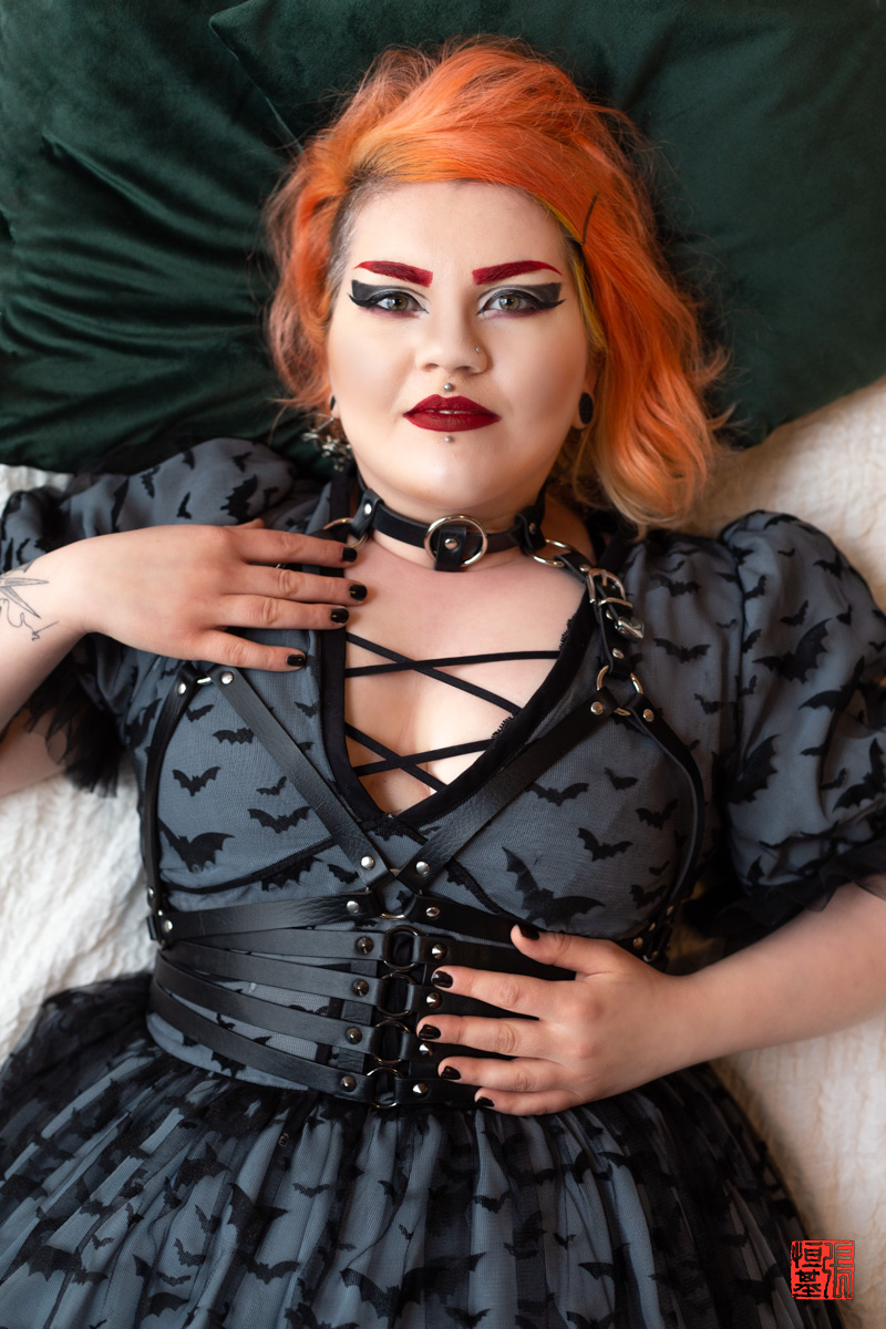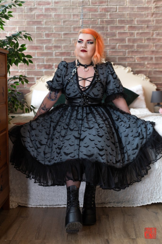 As Harley donned the dress, the creative energy in the studio crackled. We experimented with lighting, using a combination of natural light and strategically placed studio lights to highlight the intricate details of the bat pattern. We explored different poses, capturing Harley’s confidence and the undeniable rock-and-roll spirit that defines her brand.