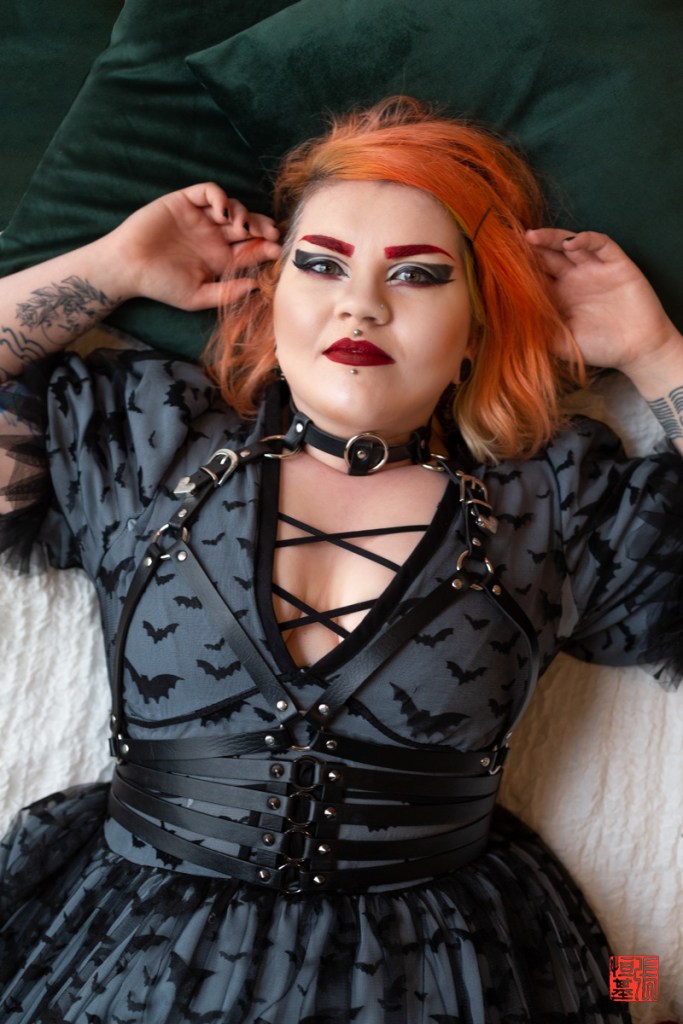 Harley, the mastermind behind the brand HarleyChainsaw Creations, wasn’t just a model for the day; she came with a vision. Her self-made bat pattern dress, a piece from her collection, was the star of the show. Stepping into Montrose Studios, a versatile space known for accommodating diverse artistic needs, we knew the stage was set for something special.