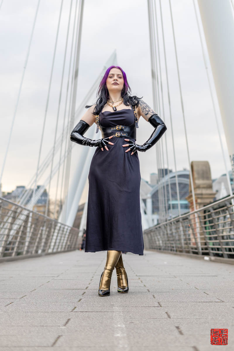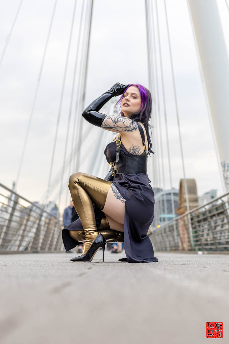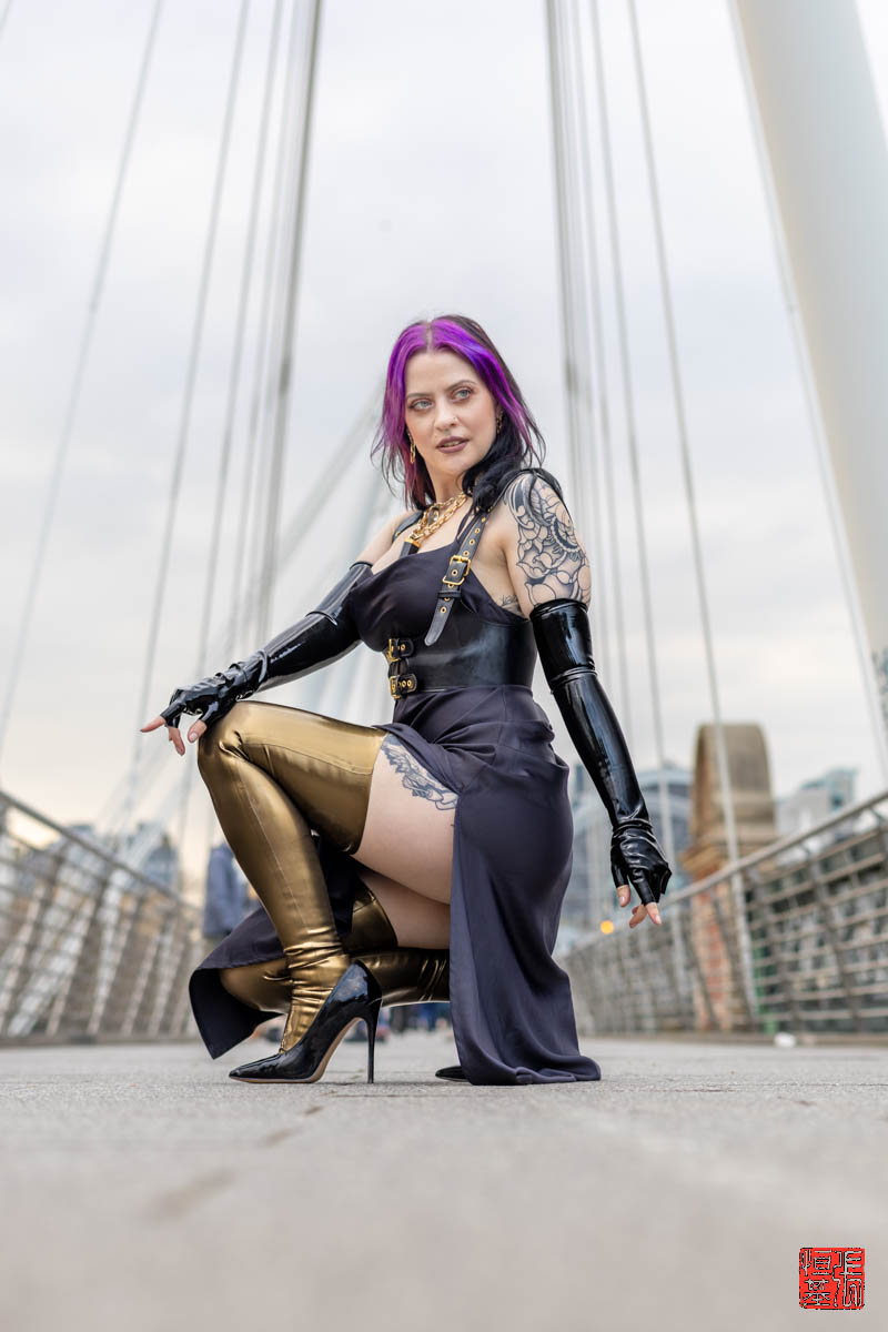 Our model, PurpleMuffinz, brought a unique energy and charisma to the shoot. As we walked along the bridge wearing a black sleek dress, black latex opera gloves and golden latex leggings. I experimented with different angles and compositions to capture her essence. The city’s vibrant atmosphere and PurpleMuffinz’s natural beauty and shiny outfit created a perfect harmony.