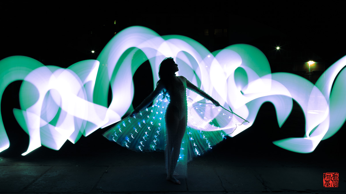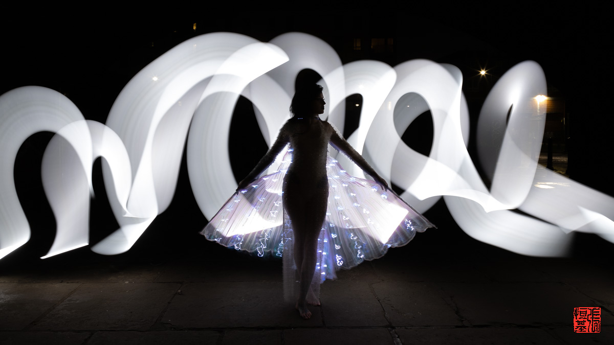 SJ Jinxx was a celestial being adorned with magnificent Isis wings. The wings, catching the fading light, seemed to shimmer with an otherworldly glow. But the real magic happened when we introduced light painting. With each deliberate movement of a light source, trails of vibrant colour danced across the scene, weaving stories of light and shadow around Jinxx.