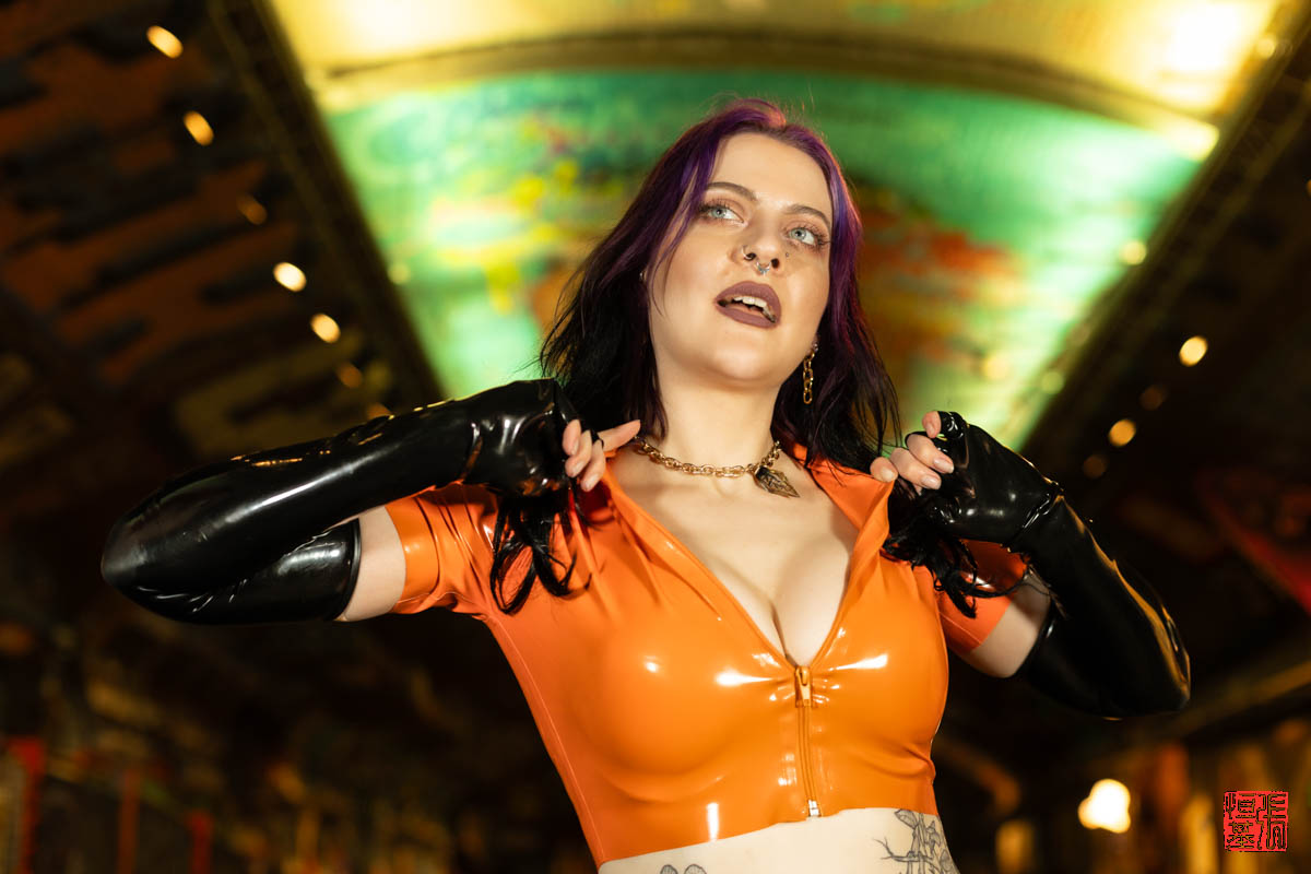 Leake Street, a haven for London’s graffiti artists, provided a kaleidoscope of colours and textures. Sprays of paint danced across the walls, each one a story waiting to be told. In this environment, PurpleMuffinz outfit – a bold combination of a latex orange top and black leggings – shimmered with a metallic sheen, creating a striking juxtaposition against the colourful backdrop.