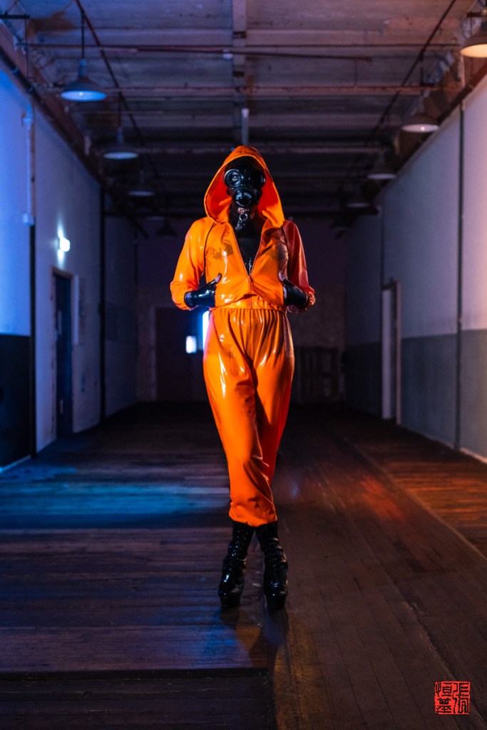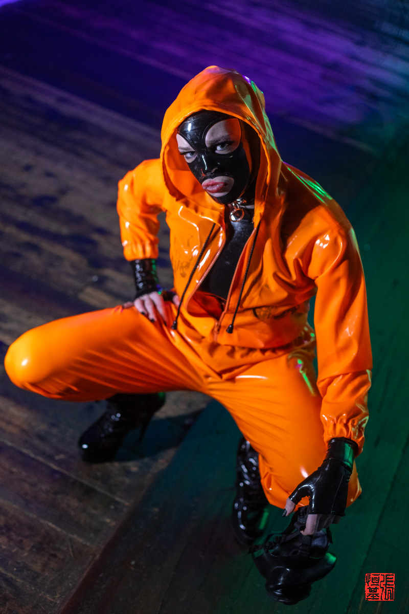 Montrose Studios became a vibrant playground for a recent shoot featuring the radiant Princess Latex Rubber Doll. Clothed in a head-turning, shiny latex with a latex orange hoodie, she wasn’t just a model; she was a burst of sunshine personified. The creative energy crackled as we experimented with colored lights, bathing the studio in a kaleidoscope of hues. The latex orange of the hoodie danced with the blues, green and purples, creating an electrifying atmosphere.