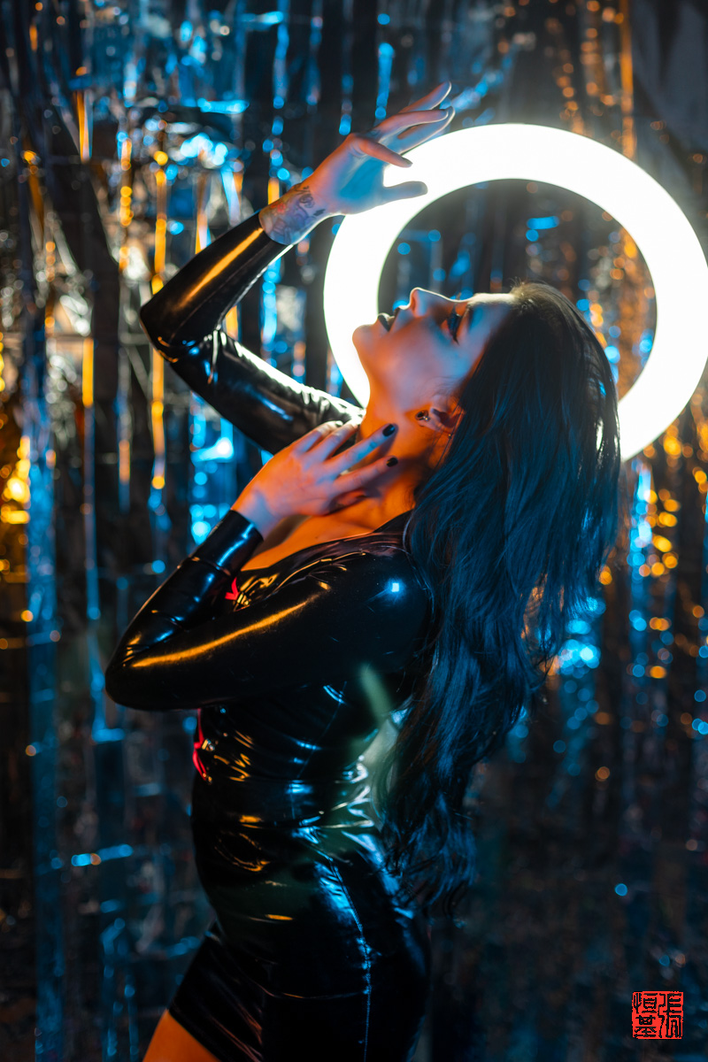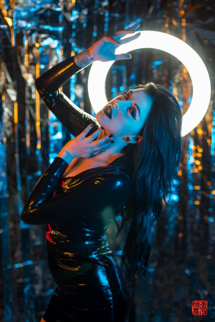 To create a truly ethereal effect, we employed a creative lighting technique. A ring light was positioned behind Jinnx, casting a soft, halo-like glow around their head. This added a touch of mystique and drew attention to their captivating features. Additionally, we used coloured lights pointing towards our silver backdrop to create a dynamic, multi-dimensional effect. The interplay of light, colours and shadow added depth and dimension to the image, enhancing the overall visual impact.