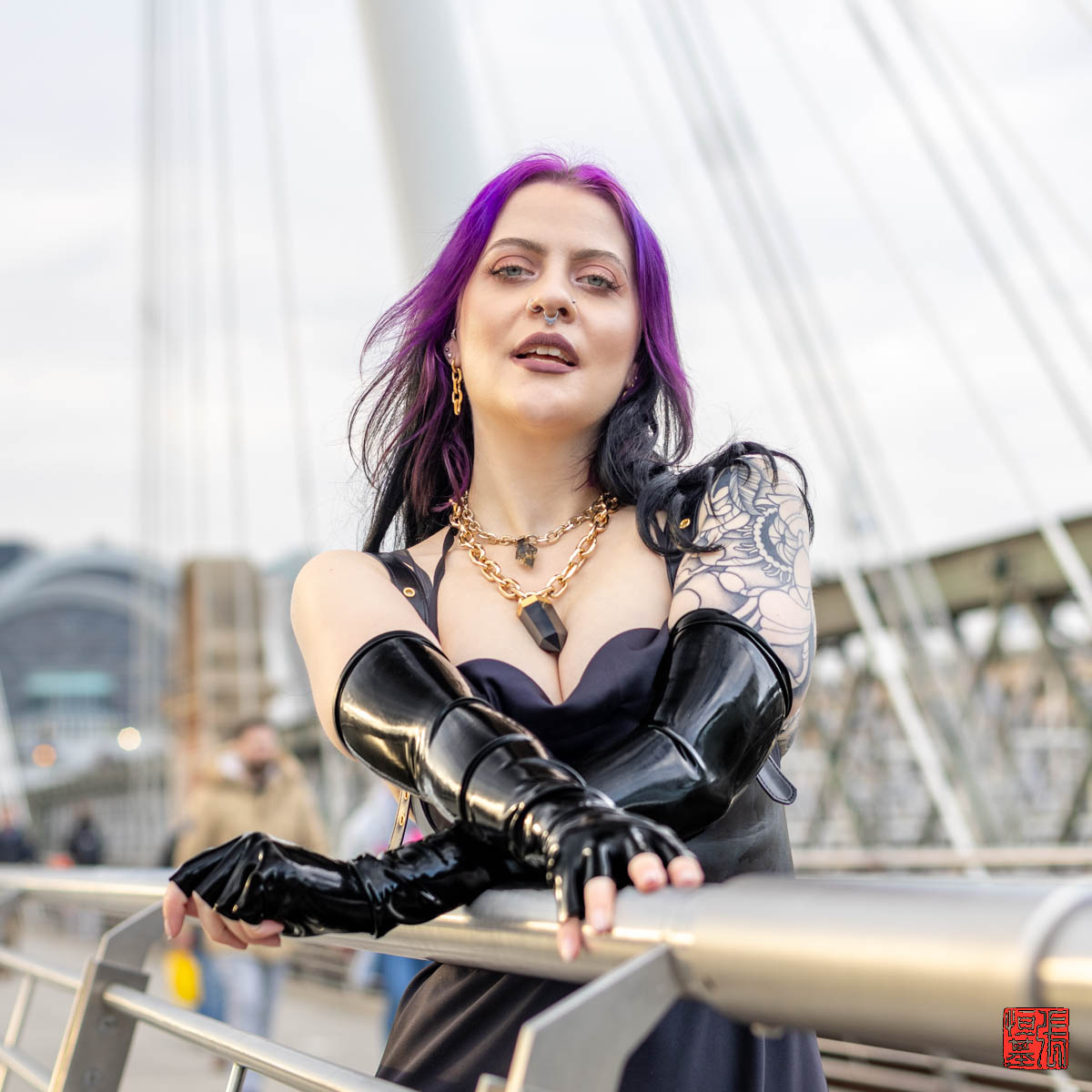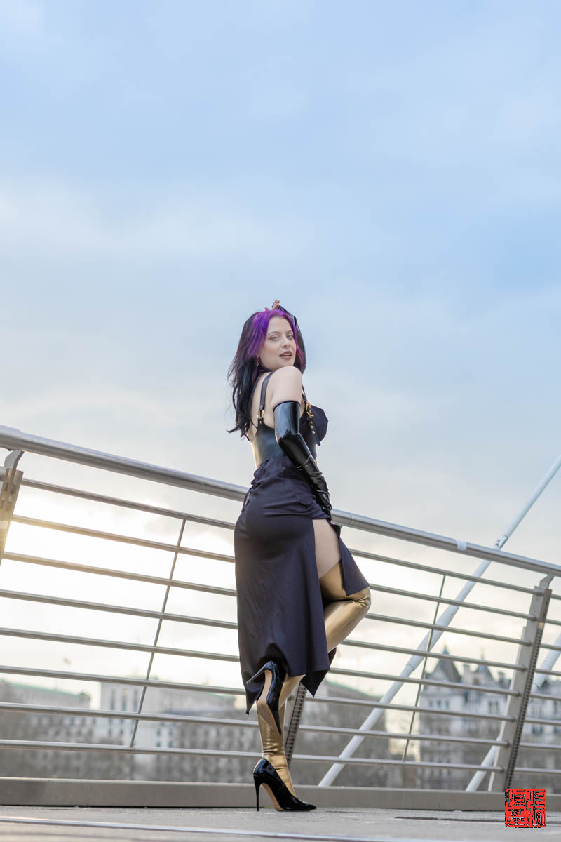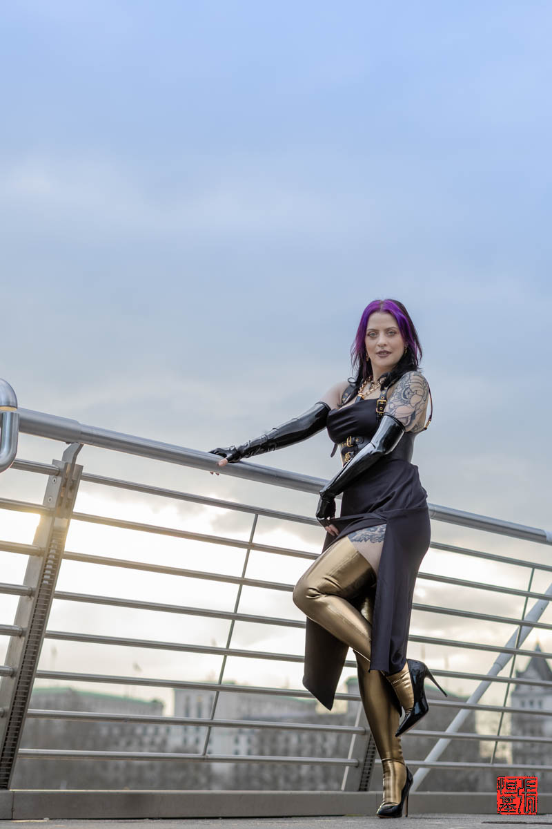 Our model, PurpleMuffinz, brought a unique energy and charisma to the shoot. As we walked along the bridge wearing a black sleek dress, black latex opera gloves and golden latex leggings. I experimented with different angles and compositions to capture her essence. The city’s vibrant atmosphere and PurpleMuffinz’s natural beauty and shiny outfit created a perfect harmony.