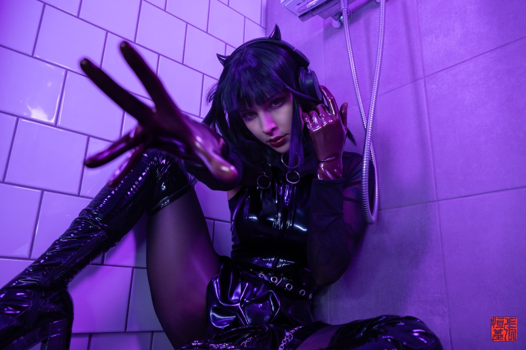 To push the boundaries of a traditional studio shoot, we decided to use a location you might not expect: a shower. The glossy tiles and reflective surfaces of the shower created some truly dynamic shots. We lit the entire area with a vivid purple light to give it that authentic cyberpunk feel, which made the black latex pop even more and Luzia showed off their flexibility whilst in front of my camera. This creative choice allowed us to capture a futuristic and edgy aesthetic, proving that the most interesting photos can come from the most unexpected places.