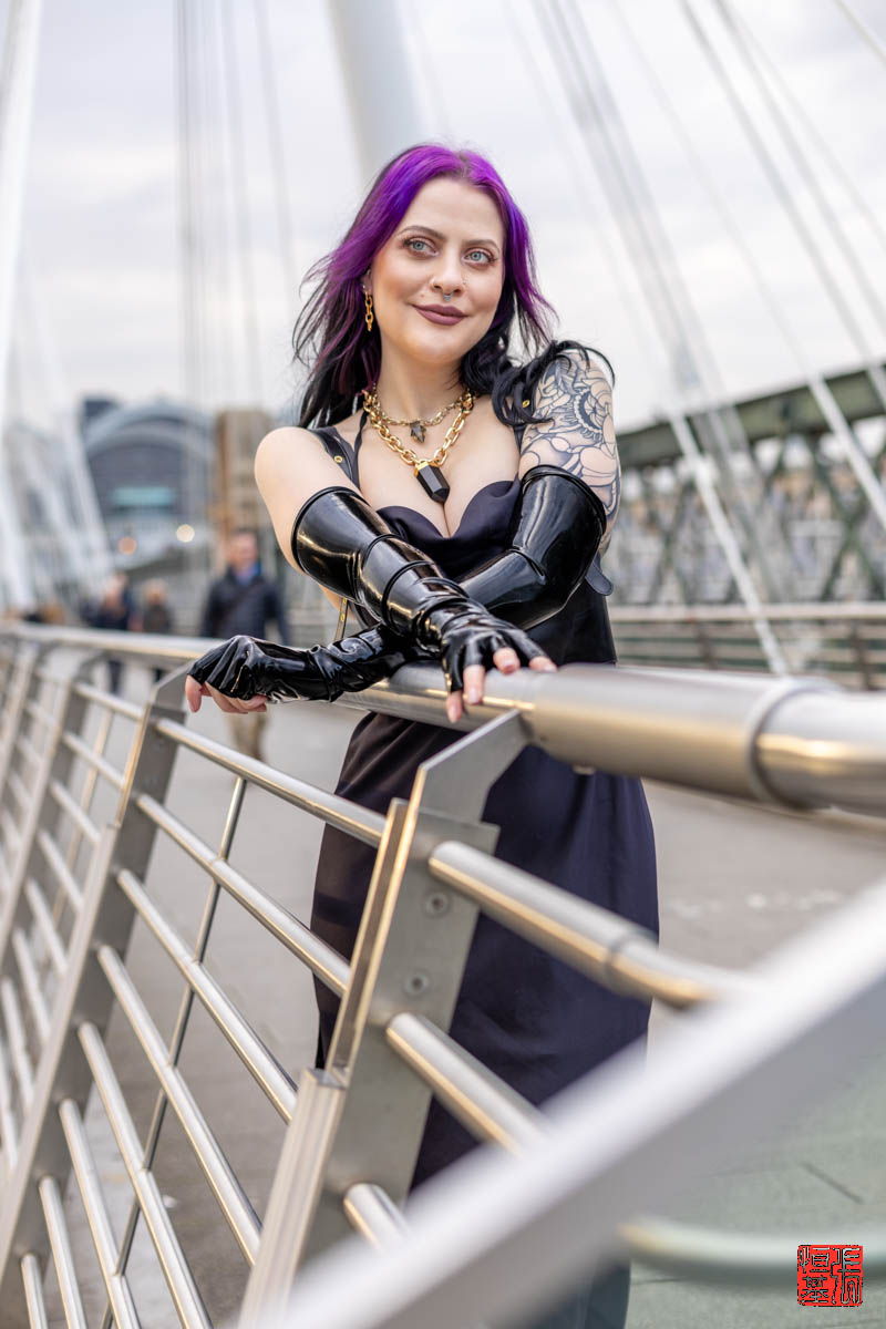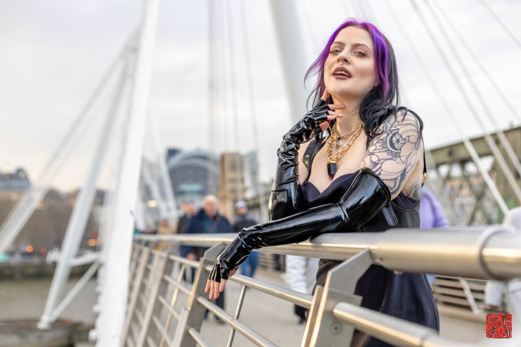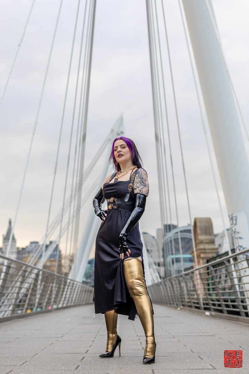 Our model, PurpleMuffinz, brought a unique energy and charisma to the shoot. As we walked along the bridge wearing a black sleek dress, black latex opera gloves and golden latex leggings. I experimented with different angles and compositions to capture her essence. The city’s vibrant atmosphere and PurpleMuffinz’s natural beauty and shiny outfit created a perfect harmony.