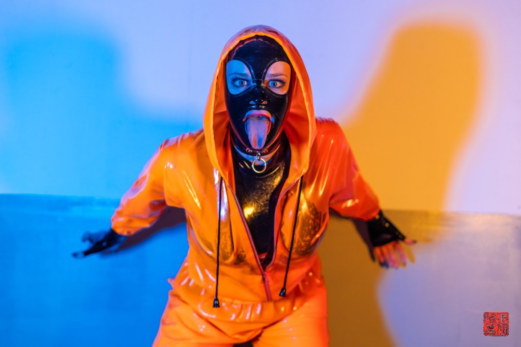 Montrose Studios became a vibrant playground for a recent shoot featuring the radiant Princess Latex Rubber Doll. Clothed in a head-turning, shiny latex with a latex orange hoodie, she wasn’t just a model; she was a burst of sunshine personified. The creative energy crackled as we experimented with colored lights, bathing the studio in a kaleidoscope of hues. The latex orange of the hoodie danced with the blues, greens and purples, creating an electrifying atmosphere.