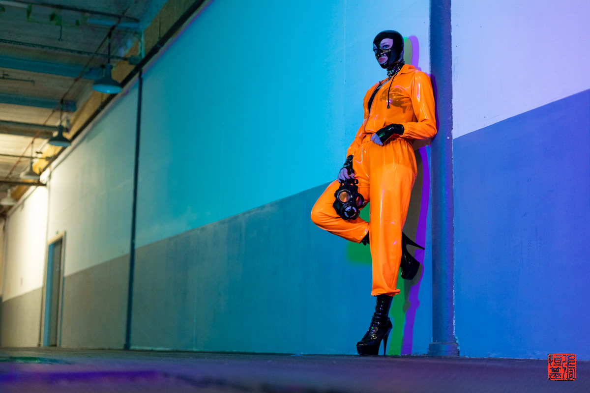 Montrose Studios became a vibrant playground for a recent shoot featuring the radiant Princess Latex Rubber Doll. Clothed in a head-turning, shiny latex with a latex orange hoodie, she wasn’t just a model; she was a burst of sunshine personified. The creative energy crackled as we experimented with colored lights, bathing the studio in a kaleidoscope of hues. The latex orange of the hoodie danced with the blues, greens and purples, creating an electrifying atmosphere.