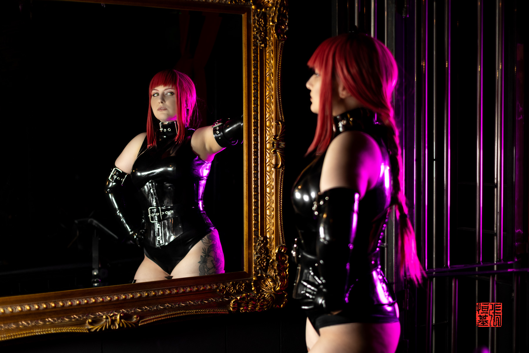 A captivating study in glamour and restraint, these images, featuring model Strelizia.cos and captured at Murder Mile Studio, showcase a model completely transformed by bold style and lighting. She’s dressed in high-shine black latex fetishwear, including a fitted corset by Libidex Ltd, opera-length gloves, and a dramatic choker collar—all accented with silver buckles by MmLatex. The look is immediately arresting, amplified by her vibrant magenta-red hair that beautifully catches the intense purple and pink lighting. The atmosphere is theatrical, with deep red velvet curtains and a cage-like structure framing the figure, suggesting a world of edgy, luxurious fantasy.