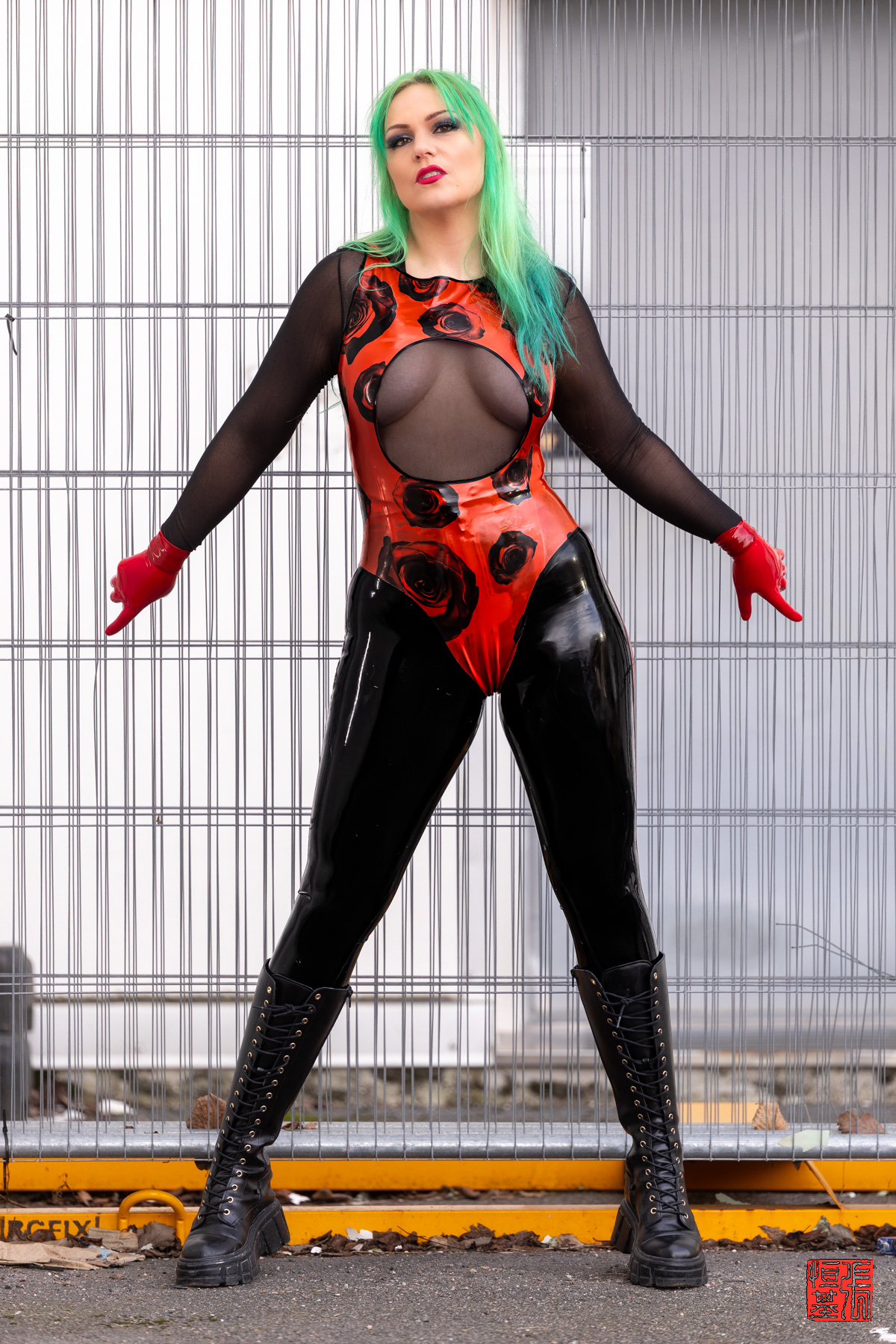 Miss Metnal was absolutely fantastic in posing against this metallic barrier, effortlessly blending vulnerability with high fashion. Her ensemble featured the stunning rose design pieces from rubbermommy.latex, showcasing their exquisite craftsmanship. She wore the intricate rose design bodysuit paired with matching leggings, all crafted by the renowned artisans at Westwardbound.
