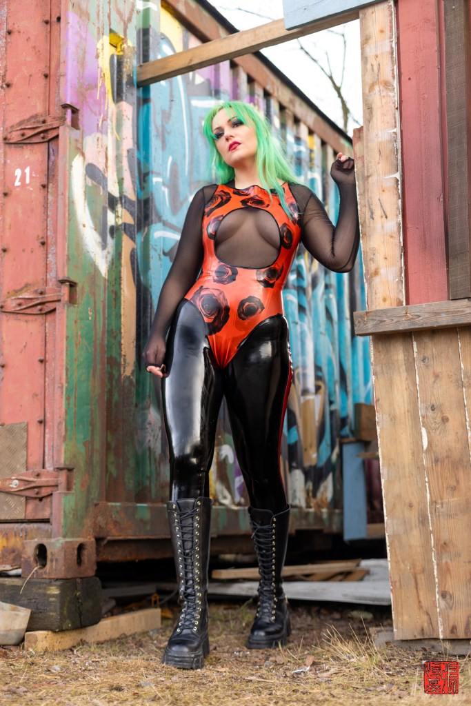 In a captivating shoot, I recently had the pleasure of photographing Miss Metnal against a vibrant backdrop of graffiti-covered shipping containers. She commanded attention in a shiny red latex bodysuit, featuring an exquisite, delicate rose design by rubbermommy.latex. This striking piece was perfectly complemented by glossy black latex leggings from Westwardbound, creating a bold and unforgettable silhouette.